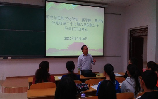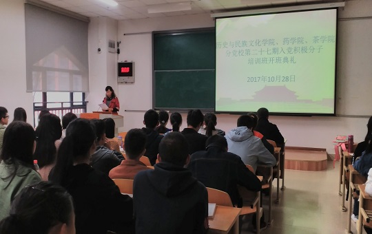 2017年10月28日上午8点30分,历史与民族文化学院、药学院、茶学院分党校第二十七期入党积极分子培训班开班典礼在明俊楼113D教室举行。历史与民族文化学院党委书记李开学和党委副书记雷方俊、药学院党委副书记张豫芳、茶学院党委副书记罗聃宁出席典礼,全体44名学员参加,典礼由茶学院辅导员盛律平老师主持。